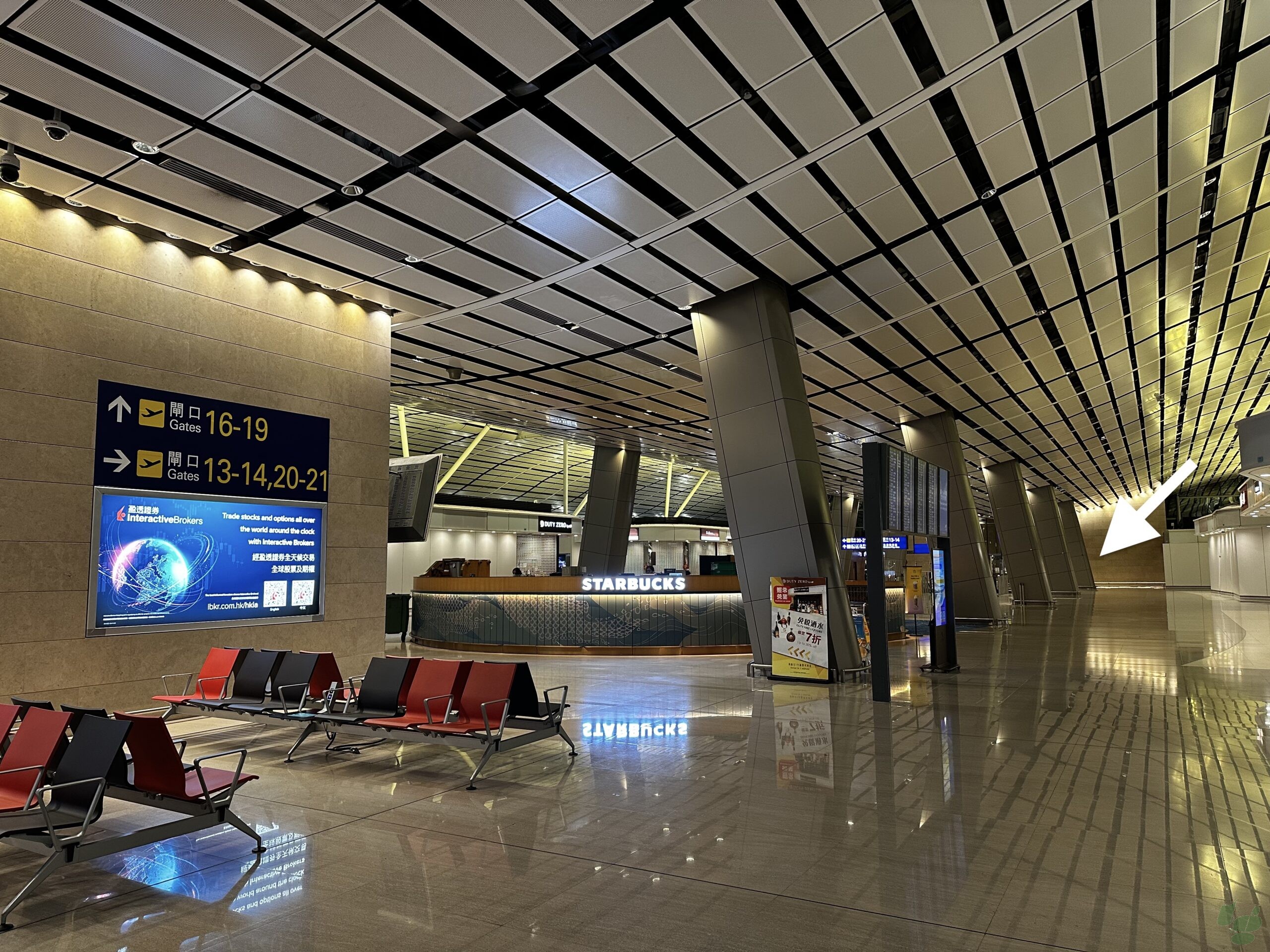ゲートNo.13-21の乗客が使用する香港国際空港のサテライトコンコースには、1箇所の喫煙所があります。