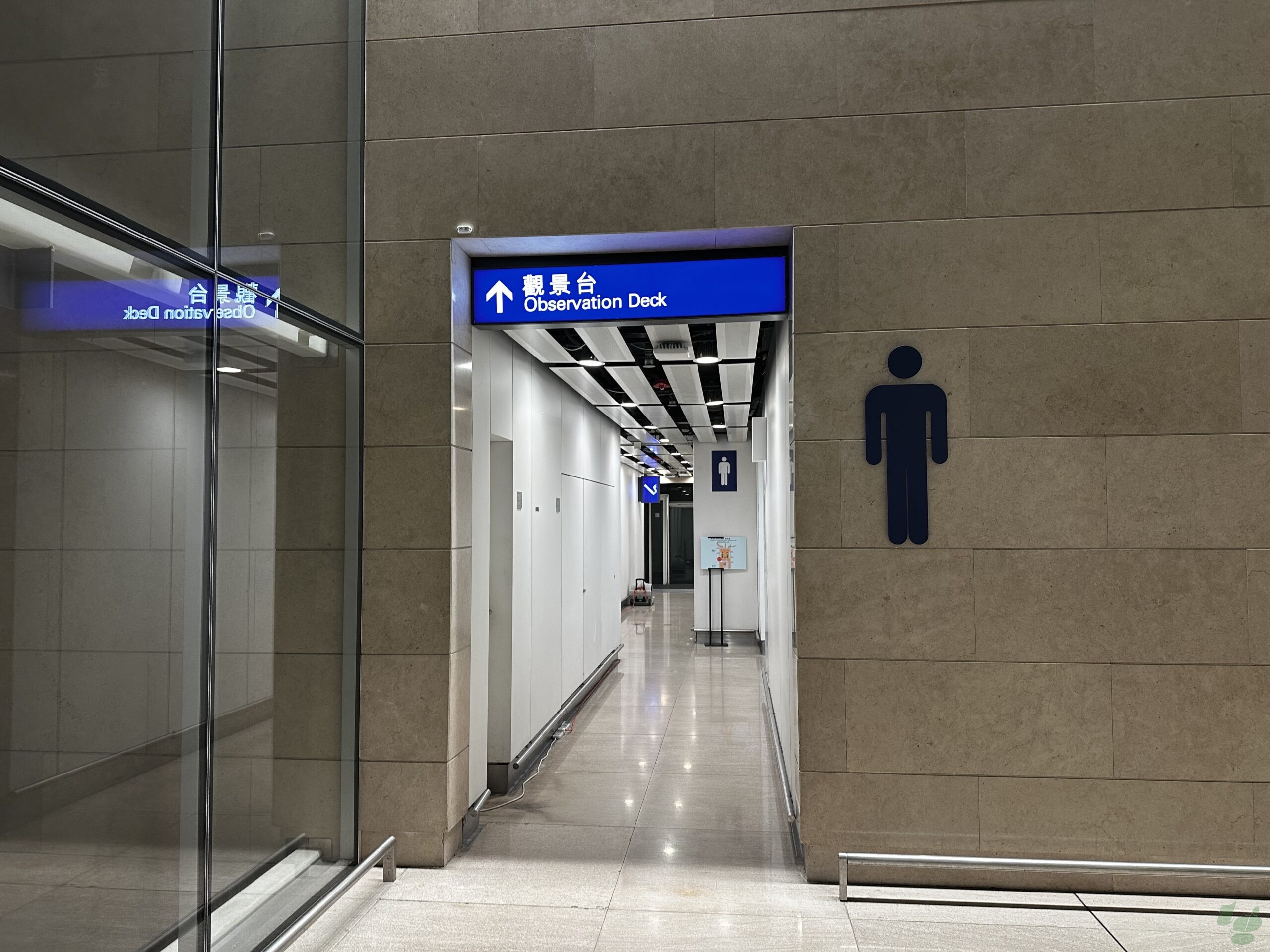 ミッドフィールドコンコースだけは、到着ロビー階にも喫煙所があります。サテライト中央のシャトルトレイン乗り場付近のトイレの先に2箇所の喫煙所があります。ただし、喫煙所のサインはないので「觀景台 Observation Deck」と書かれた展望デッキをめざす必要があります。